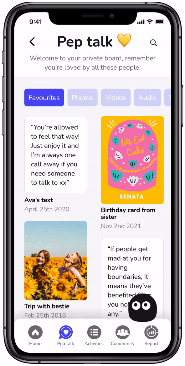 Your private board filled with genuinely encouraging content from everyone that knows and loves you. Upload whenever you want & keep your warm and happy memories all in one place. No more randomly generated cheesy quotes!