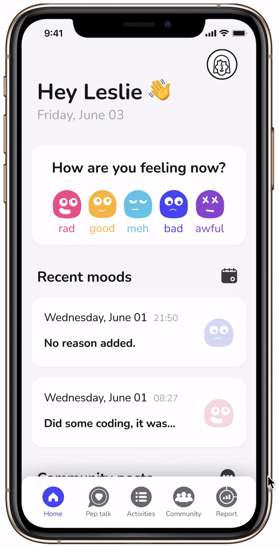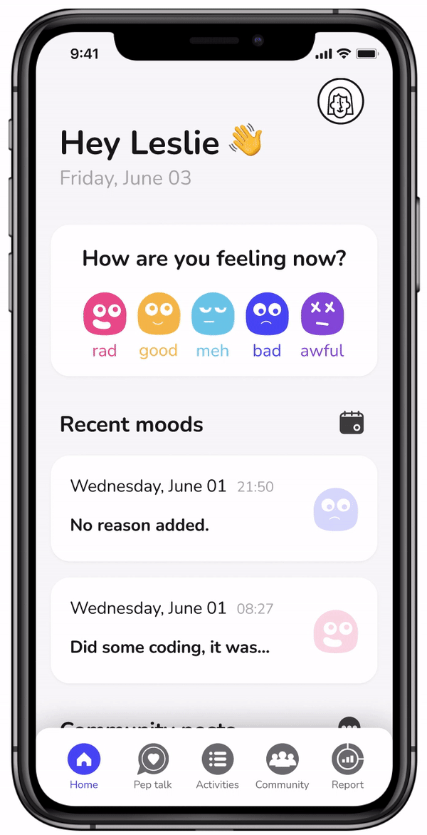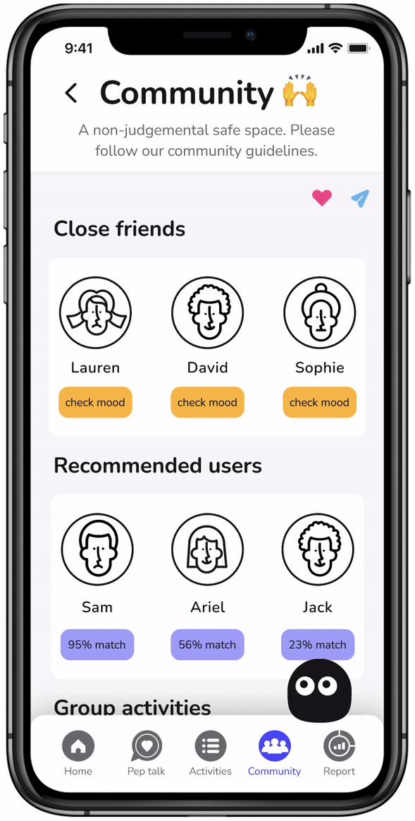 Our community is a non-judgemental safe space for you to express your feelings. Check your friends’ recent mood entries to make sure they’re ok, or say hi to the recommended users that have similar mood patterns as you - turn your mood buddies into real-time besties!